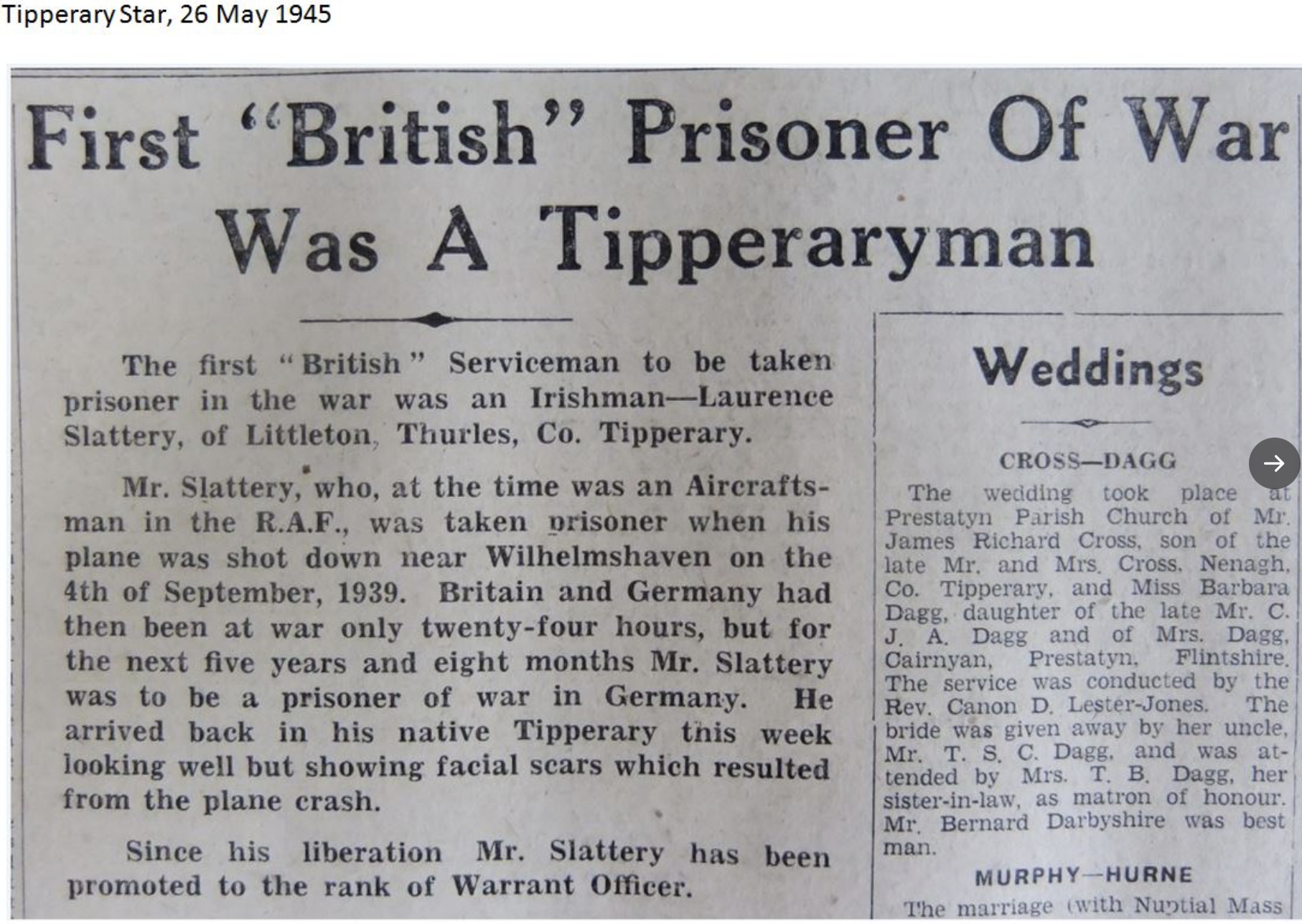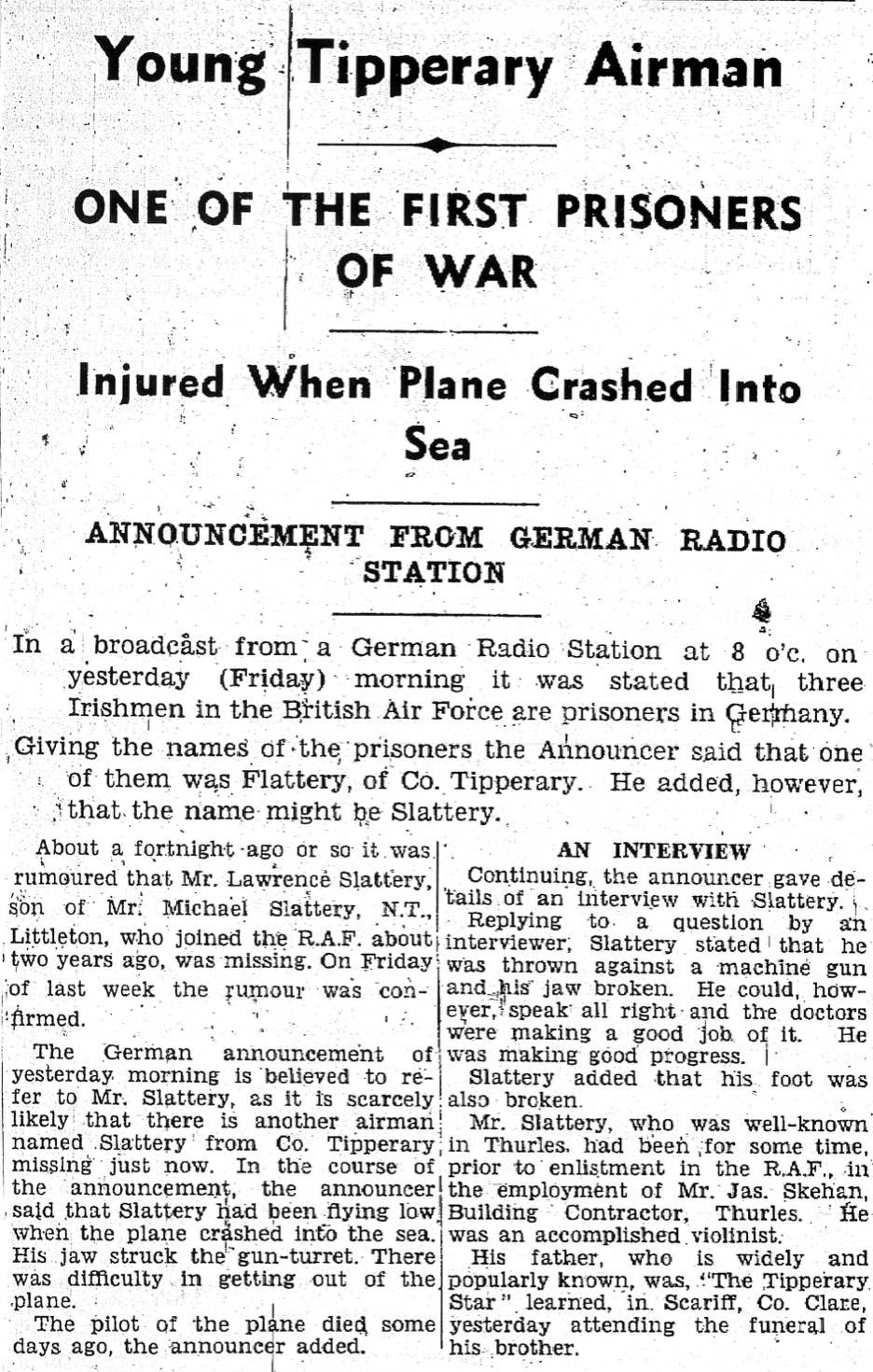 Tipperary-born Larry Slattery was the first prisoner of World War II, shot down the day after war was declared. He was rescued from the sea by a German merchantman and treated for severe head injuries, before joining his crewmate George Booth who had a broken ankle in the naval hospital at Wesermunde. There, they were interviewed by German and United States radio commentators.